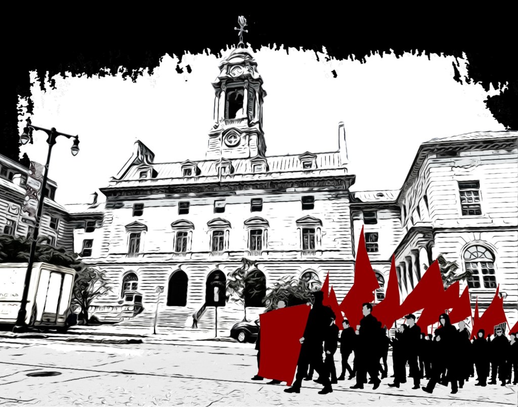 Along the way, they gave Nazi salutes and yelled racist and homophobic slurs at people. Upon arrival at City Hall, they unfurled a banner that read “Defend white communities.”