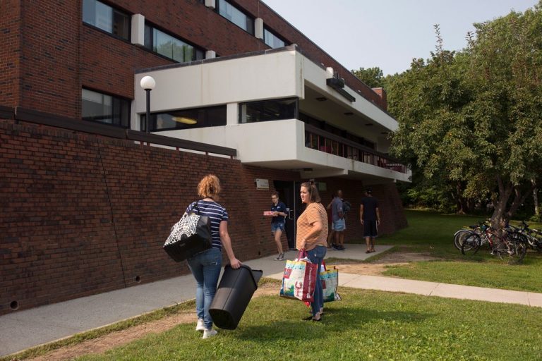 Alayna Clark, near left, and Melody Harrington move their belongings Friday into their temporary dorm, Surfsite Hall. The two friends from Augusta hope to move into the dorm they were originally assigned, Spring Point Residence Hall, once all the mold is removed from that building.