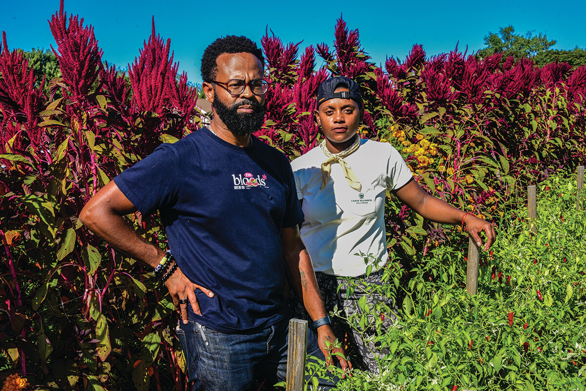 Taylor surveys the adjacent crops—in addition to the amaranth and indigo, there are rows of sweet potatoes, green beans, tomatoes, and bright marigolds nestled below the amaranth like stray bursts of gold. Those crops will head to Farm Alliance’s market stall at the 32nd Street Farmers Market in Waverly, and many of the peppers will migrate to Gjerde’s kitchen.