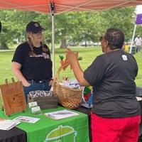 No More Empty Pots staff member stands at their booth table, listening to a community member. The table includes a presentation of different resources the organization offers. Photo courtesy of No More Empty Pots.