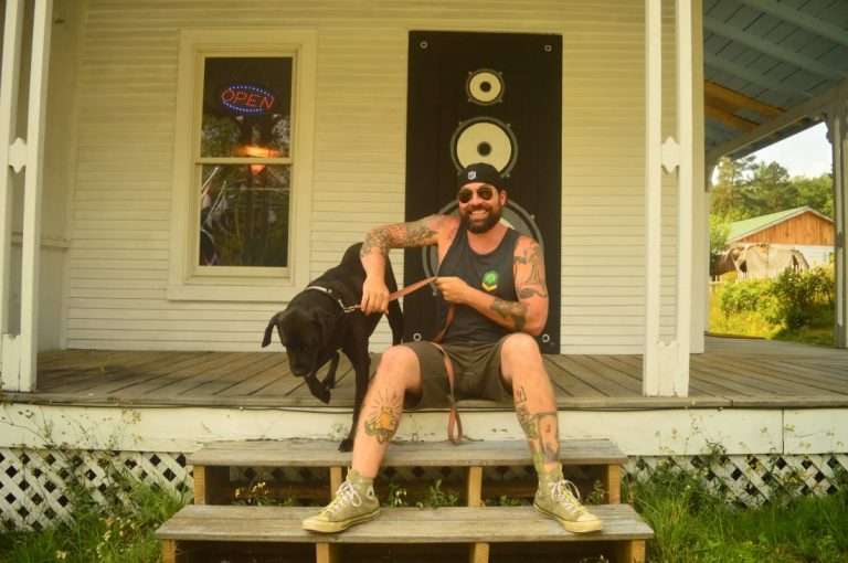 Tim Branfalt and his dog, Griffey Richard, sit on the porch outside Black Dog Records in Bloomingdale on Wednesday. (Enterprise photo — Aaron Cerbone)