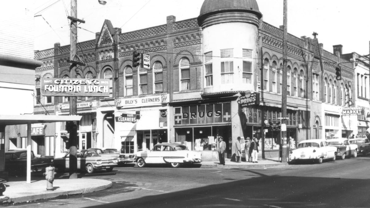 The heart of the Albina district, the corner of North Williams and North Russell, was once the center of a small yet thriving business district. This circa 1962 image shows the area before these businesses were torn down in the early 1970s as part of large-scale urban renewal projects.