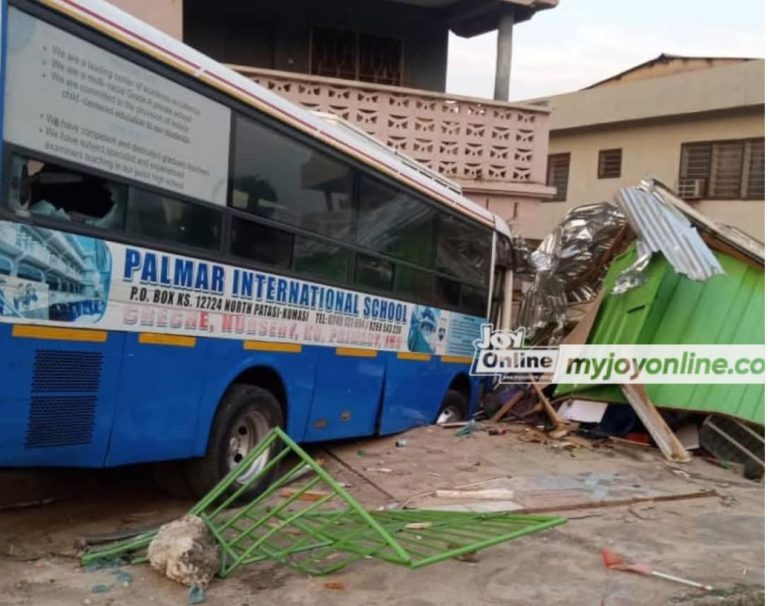 Two people have died at Patasi in Kumasi after a school bus lost control of its steering and crashed into them in front of a storey building.